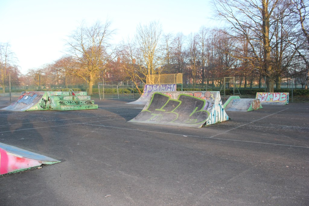 While there is no doubt that provision of a play area is beneficial to both children and the wider community, play area designers should consider whether their park design limits the different dimensions of free play (e.g., physical, object, pretend). For example, Beckett play area transmits that only accompanied children can play legitimately in this designated space. In effect, not only does this restrict the autonomy of play, but it prevents children from gathering and playing away from adult supervision; play designers should bear in mind that not all children have the resource of a freely available responsible adult to chaperone their play. Moreover, adult supervision may hinder children’s risky play – an important component in their development, health and wellbeing (Brussoni et al., 2012). Another factor to consider concerns the play provision for older children, given they too are covered by UNCRC (1989). Beckett play area makes clear it is not designed for children aged fourteen and above. Given that adult accompaniment is a requirement too, it communicates that autonomous children younger than fourteen are not welcome either. This transmits to older children, as Brunelle et al. (2018, p.362) highlight, they are not welcome in “the public realm for a variety of reasons.” As Brunelle et al. (ibid.) point out, older children “are often purposely designed out of public spaces” to satisfy adult concerns about safety, criminality, and morality. To address this, Beckett Park provides a skate park for older children (Photo D). While this may be considered to be an inclusive action by Leeds City Council directed at older children, Brunelle et al. (ibid.) stress that “skate parks serve as a way to control youth behaviour.”